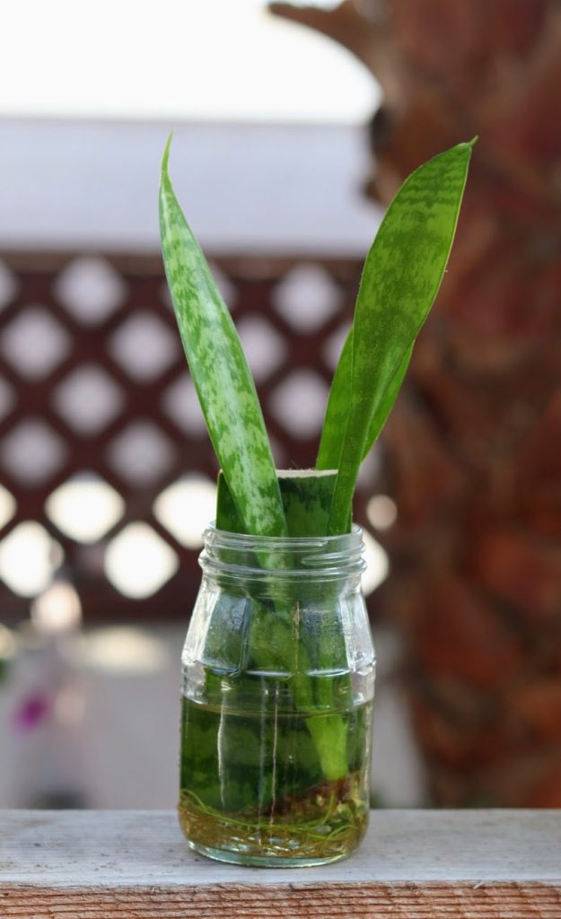 Carefully snip smaller plantlets from mother plant, remove lower leaves, and place into small bottle or jar, roots should form fairly quickly.